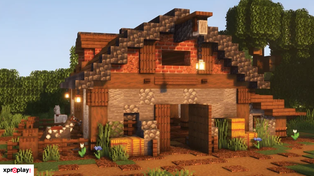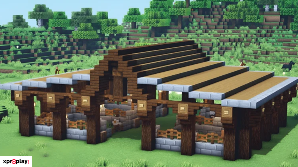 As shown in the tutorial, the barn also has enough space to place a Nether portal, which adds to its usefulness in a Survival world. To build the exterior, you’ll mainly need stripped oak logs and spruce blocks, keeping the material list fairly simple.