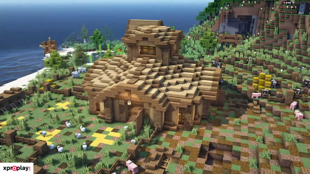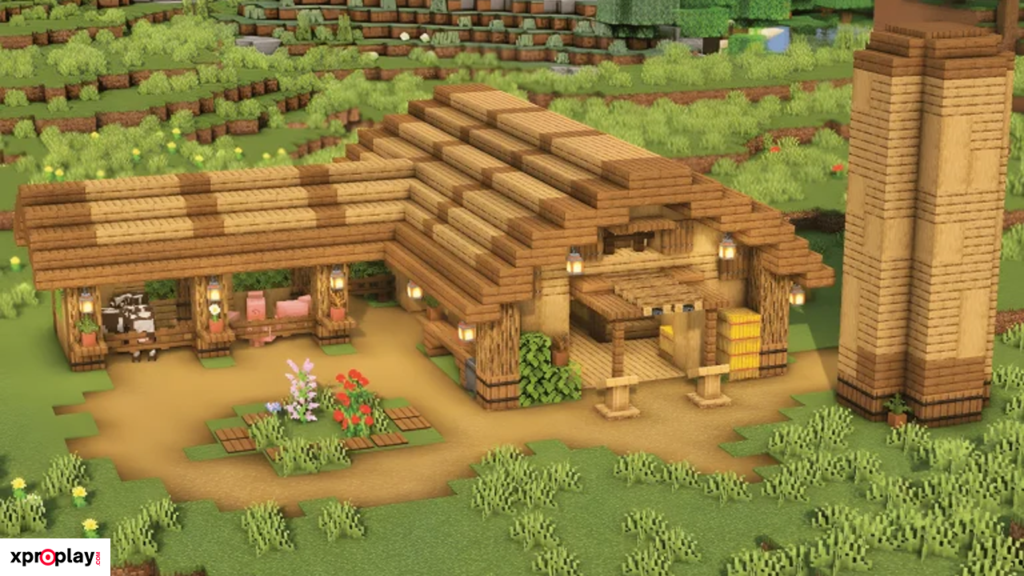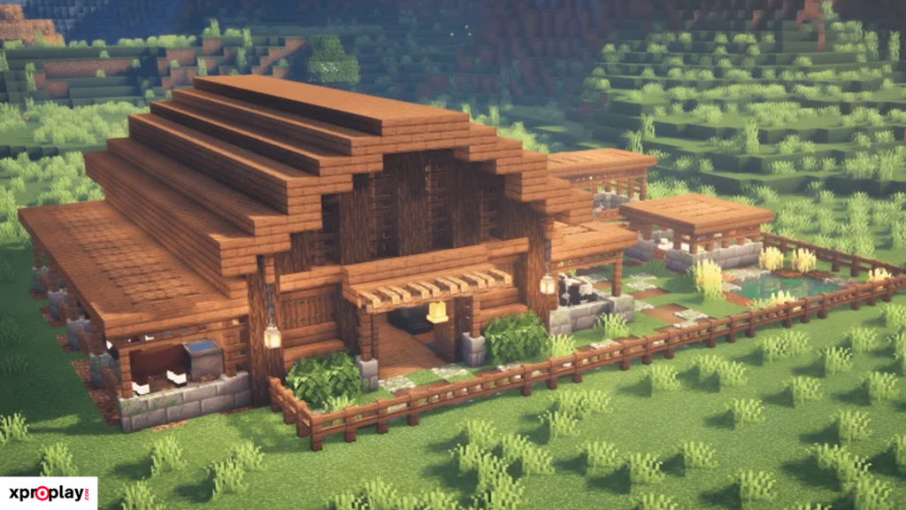 It is extremely easy to construct, using common Minecraft blocks like wood and stone, making it perfect for Survival mode. The barn’s footprint is essentially a large square patch of land, as shown in the tutorial video.